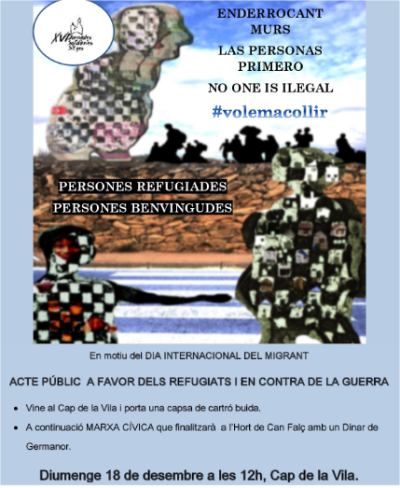 Tras la presentación de las jornadas esta semana, las actividades continuarán el próximo 18 de diciembre, a las 12 horas en el Cap de la Vila, con un acto público en favor de los refugiados y contra la guerra con motivo del Día Internacional de los Migrantes. Durante el acto se construirá un muro con cajas con las aportaciones de todos los participantes y se hará la lectura de un manifiesto. Posteriormente, se hará el derribo del muro y se hará una caminata por las calles de la villa. El acto contará con la colaboración con el Grupo Scout de Sitges.