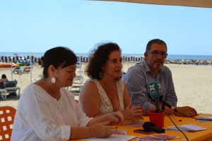 La concejala de Promoción Económica, Turismo y Playas, Aurora Carbonell; la directora de Museos de Sitges, Vinyet Panyella; y el presidente de la Asociación Turística de Servicios de Playas de Sitges, Manel Martínez, han presentado hoy viernes, en la playa de la Barra, la campaña Disfruta del sol del arte. Y de la magia de los museos.